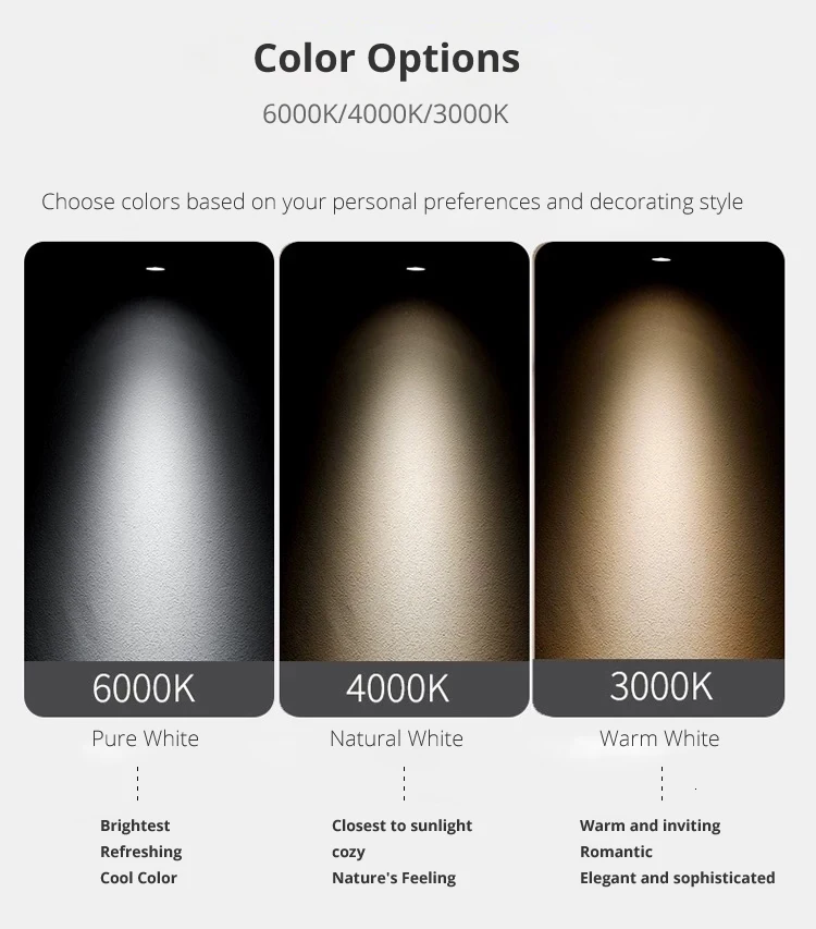 Light Color: Warm White 3000K; Natural White 4000K; Pure White 6000K